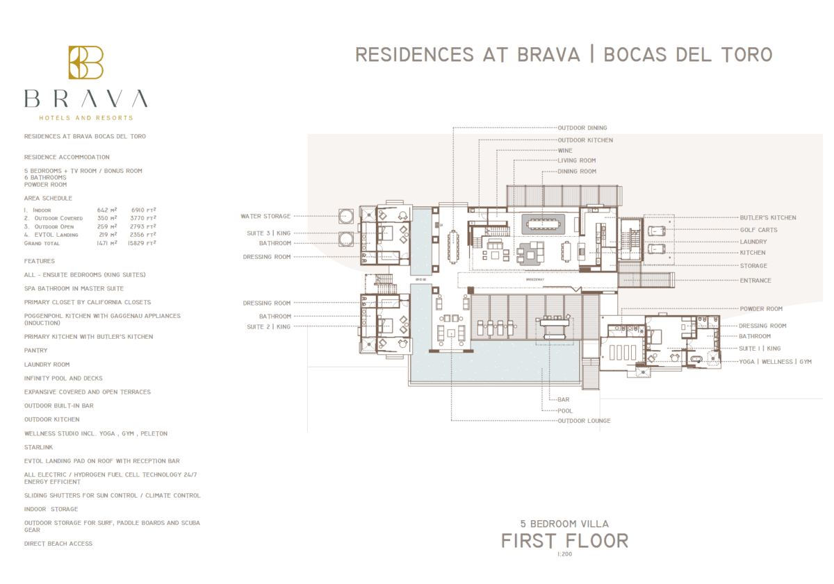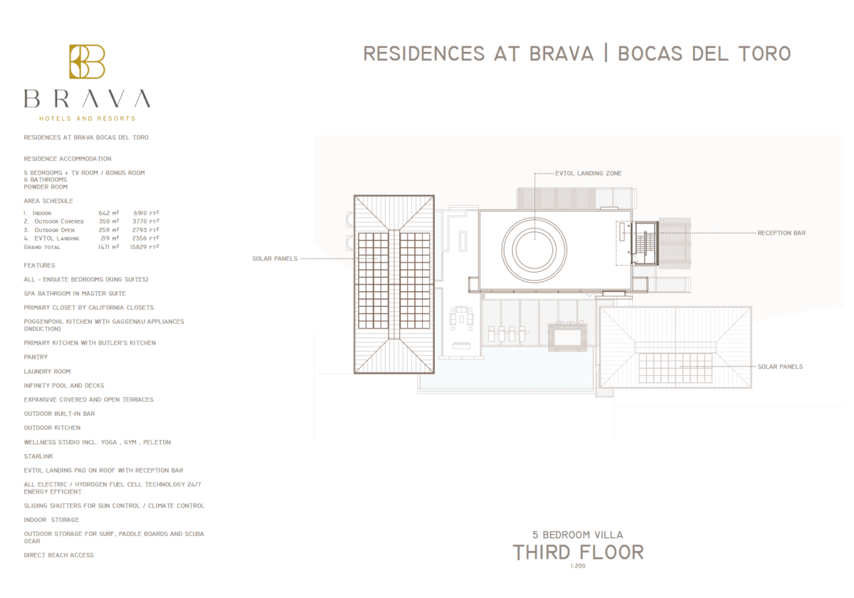 An infinity-edge pool merges effortlessly with the horizon, offering a stunning centerpiece to the outdoor living space, while direct beachfront access invites residents to step onto pristine sands at a moment’s notice. A dedicated wellness center within each home provides a private retreat for rejuvenation, blending eco-conscious innovation with unrivaled luxury, and atop each home, a dedicated roof landing pad accommodates the Brava Electric Vertical Take-Off and Landing (EVTOL) aircraft, ensuring swift, eco-friendly travel. These residences fuse cutting-edge sustainability with luxury, delivering a tropical sanctuary of sophistication and convenience and tropical allure.